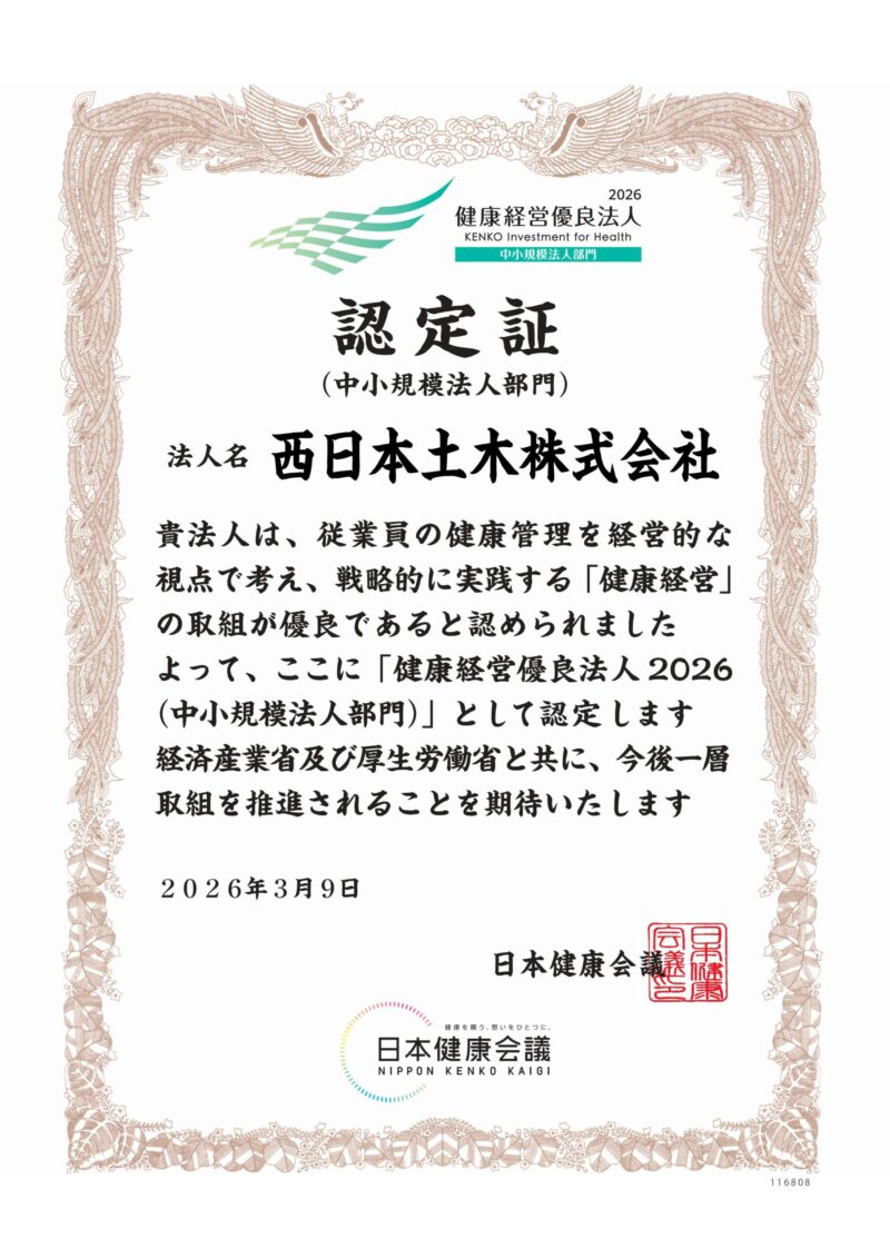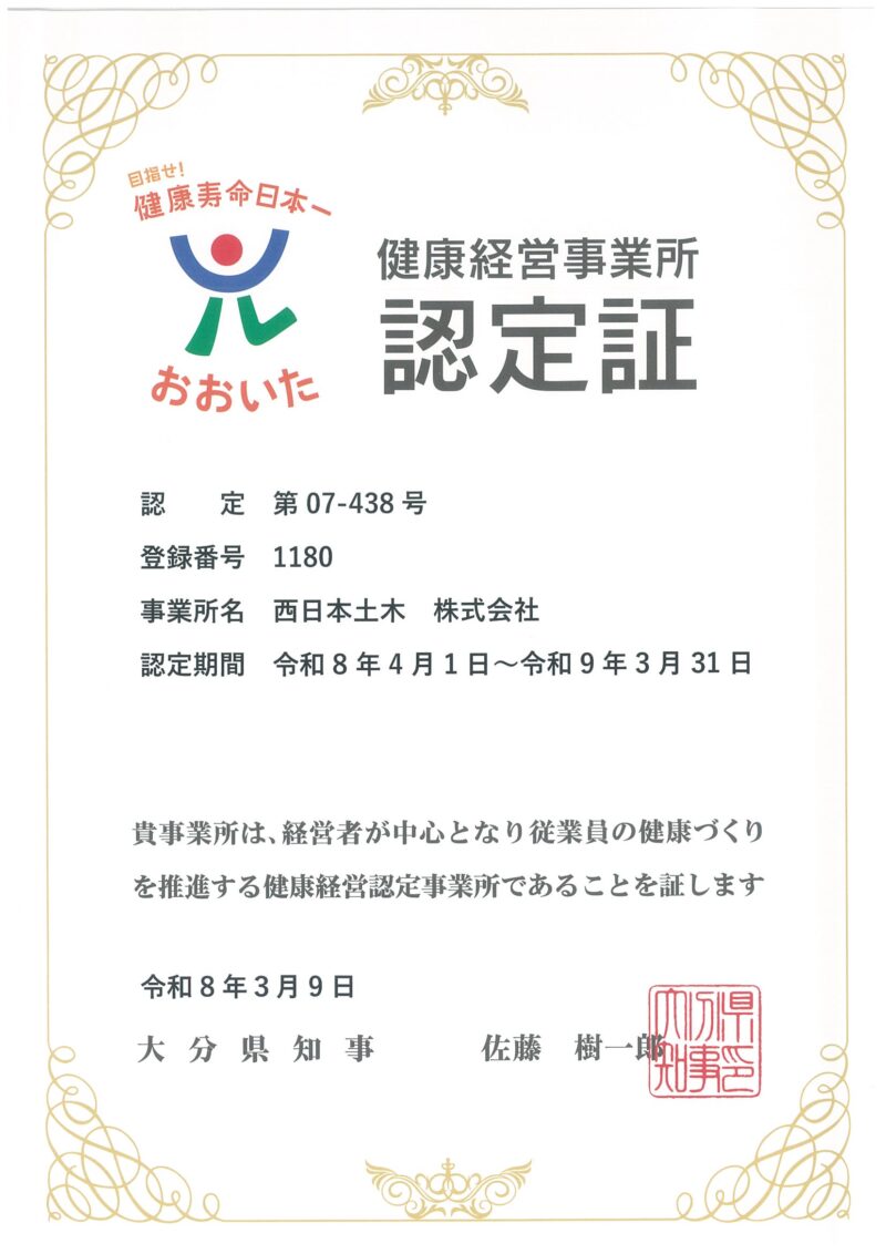 西日本土木(株)は今年も「健康経営優良法人2026」(中小規模法人部門)と大分県の「健康経営事業所」に認定されました。