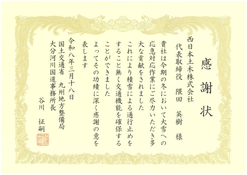2026年3月18日(水)、1月10日~11日、23日~24日、2月8日の大雪の際、凍結防止剤の散布やグレーダーによる除雪作業などの応急対策作業を行った企業に、大分河川国道事務所から感謝状が贈呈されました。